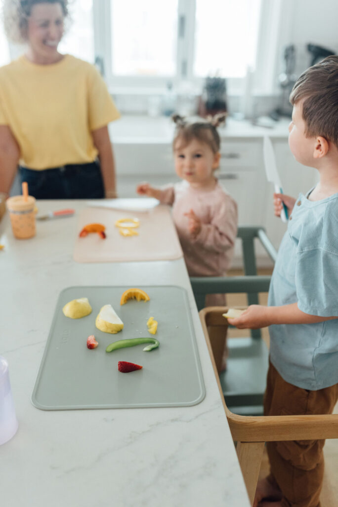 My kids use toddler towers while they cut soft fruits and vegetables at the counter for their snacks. They participate in making smoothies and baking with me, too! Food prep activities take the pressure off of eating. Once that pressure is removed, they are more likely to explore the food themselves.