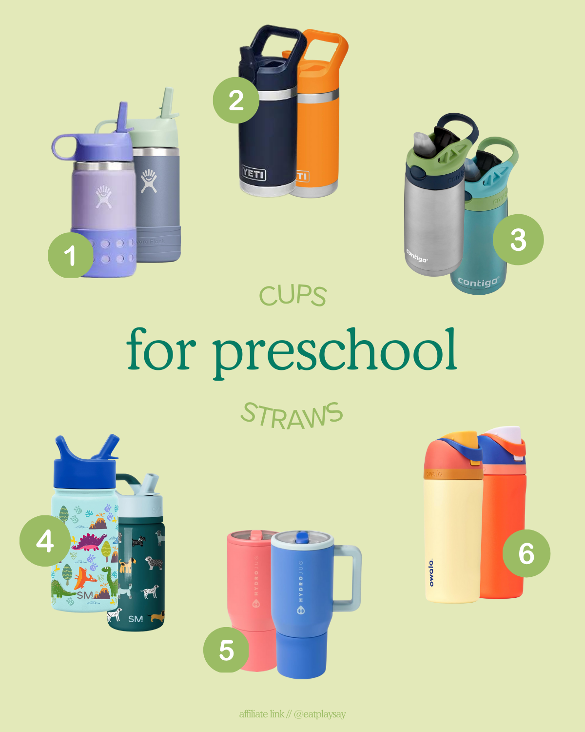 These cups are on the preschool list because they all have one thing in common. They all have a hard straw or a harder to drink from straw! Hard straws are not recommended for little ones because of the mouth injury risk.
