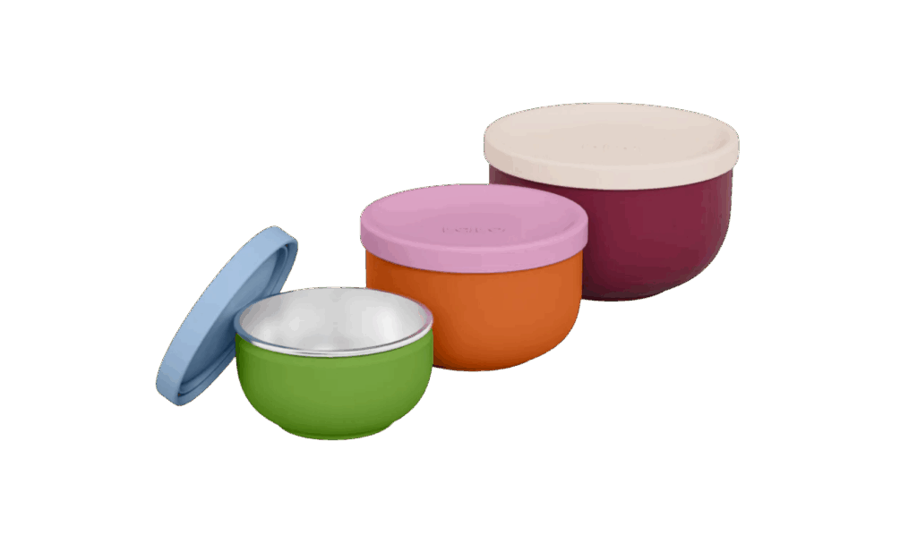 Soft silicone in bright colors protects the stainless steel bowls from scratches and dents. An added bonus: the nesting design saves space with storage!
