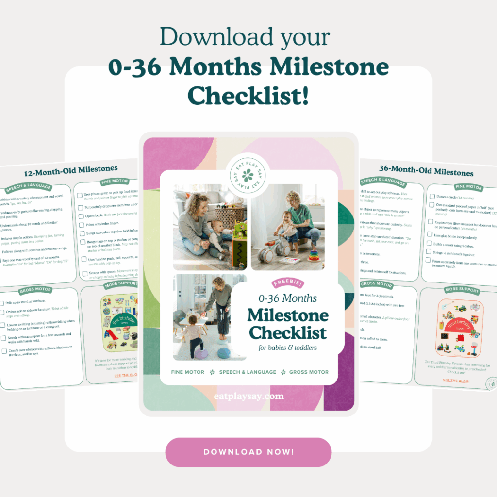 We have a free resource that lists down all the gross motor, fine motor and speech-language milestones to expect from birth to 3 years.