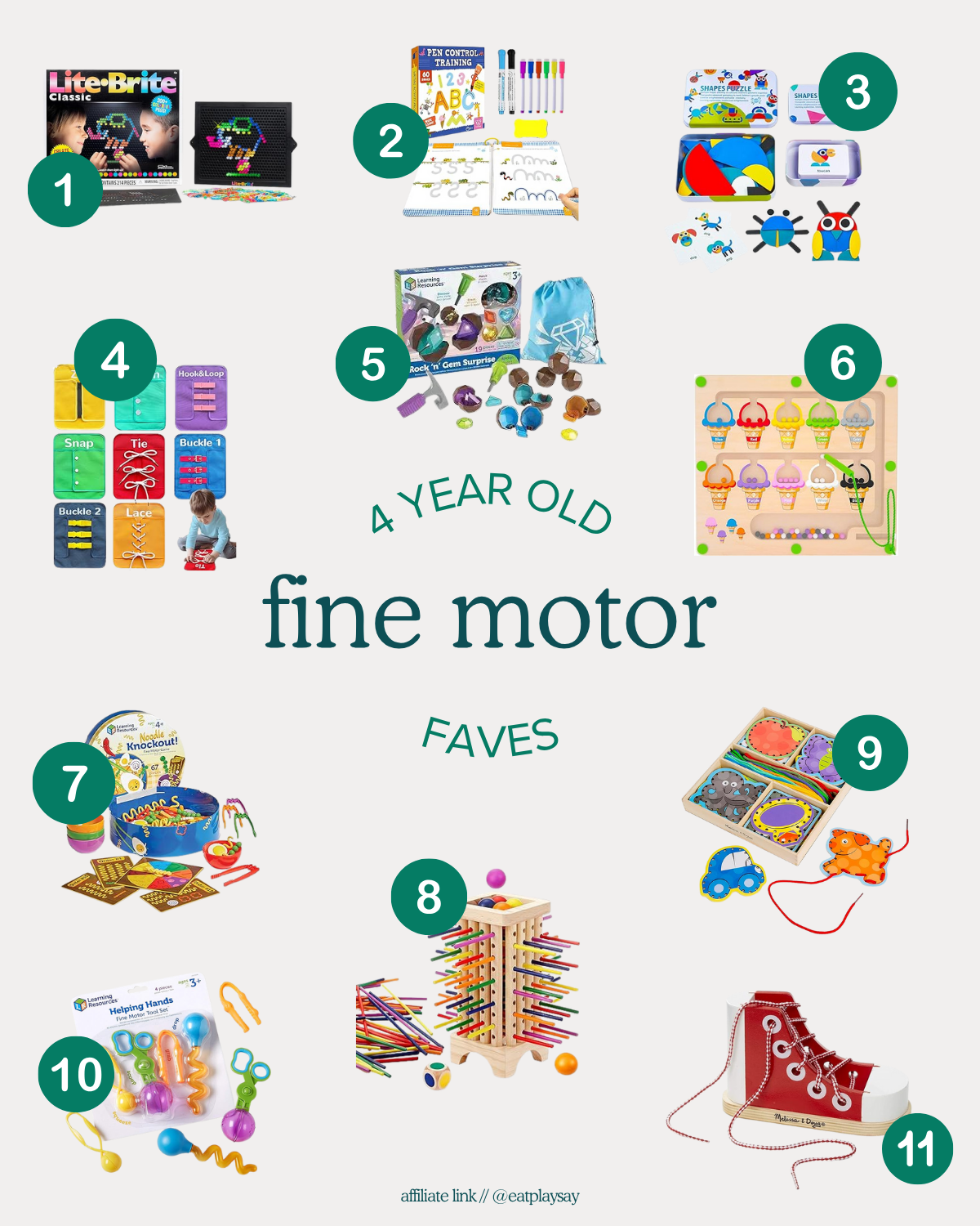 Lalo Workbench: This is sturdy pretend play workbench and we love it! Support fine motor and pretend play skills all at once! Find something that is “broken” or needs “fixing” and get to work. Model how to use the tools, but also let your child troubleshoot. Then narrate the process from start to finish! It’s such a fun building toy that will last years!